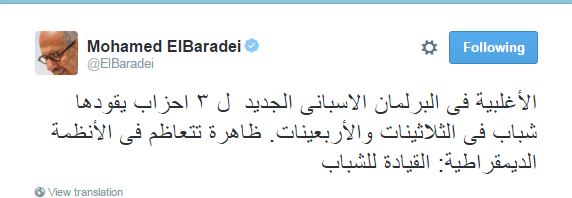 وكان محمد البرادعي، قد قال -في تغريدة له-: “الأغلبية في البرلمان الإسباني الجديد لـ3 أحزاب يقودها شباب في الثلاثينيات والأربعينيات، ظاهرة تتعاظم في الأنظمة الديمقراطية، القيادة للشباب”.
