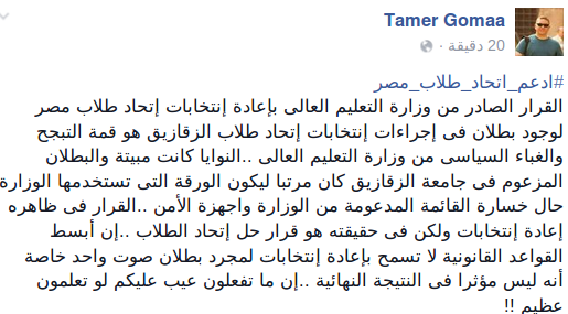 وقال جمعة في منشور له على حسابه الشخصي بموقع التواصل الاجتماعي” فيس بوك” :”القرار الصادر من وزارة التعليم العالى بإعادة إنتخابات إتحاد طلاب مصر لوجود بطلان فى اجراءات انتخابات إتحاد طلاب الزقازيق هو قمة التبجح والغباء السياسى من وزارة التعليم العالى” .
