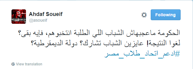 وقالت الكاتبة والروائية أهداف سويف عبر حسابها على موقع “تويتر”: “الحكومة ماعجبهاش الشباب اللي الطلبة انتخبوهم، فإيه بقى؟ لغوا النتيجة، عايزين الشباب تشارك؟ دولة الديمقرطية؟ ادعم اتحاد طلاب مصر”.