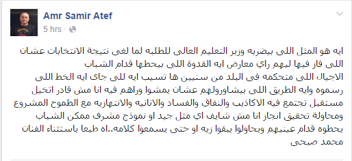 ويتساءل المؤلف وكاتب السيناريو عمرو سمير عاطف عبر “فيس بوك”: “ايه هو المثل اللى بيضربه وزير التعليم العالى للطلبة لما لغى نتيجة الانتخابات عشان اللى فاز فيها ليهم رأي معارض، إيه القدوة اللى بيحطها قدام الشباب”.