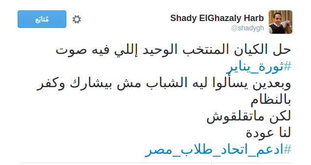 وقال حرب في تغريدة له على موقع التدوين المصغر ” تويتر” :” حل الكيان المنتخب الوحيد إللي فيه صوت #ثورة يناير وبعدين يسألوا ليه الشباب مش بيشارك وكفر بالنظام لكن ماتقلقوش لنا عودة”.