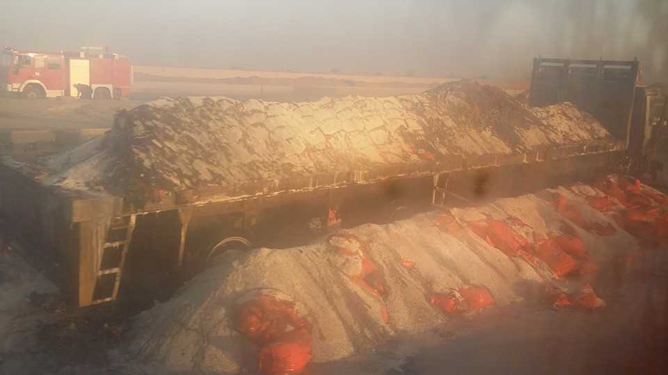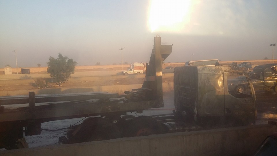 شهد طريق مصر- الإسماعيلية صباح اليوم الجمعة انفجارًا هائلاً لسيارتي نقل محملتين بمواد كميائية، عطل حركة المرور بالقرب من مدينة العاشر من رمضان؛ حتى تمكنت إدارة الدفاع المدني من السيطرة على النيران.
