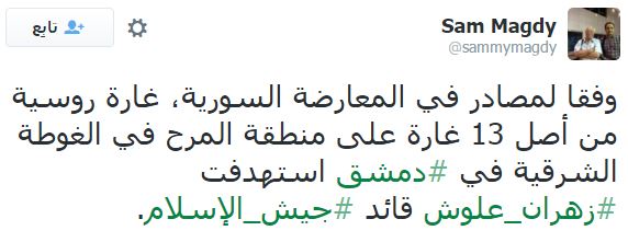 بينما أكد الصحفي سام مجدي في تغريدة له عبر حسابه الشخصي على موقع التواصل الاجتماعي “تويتر” “أنّه وفقًا لمصادر في المعارضة السورية، فإن غارة روسية من أصل 13 غارة على منطقة المرح في الغوطة الشرقية في #دمشق استهدفت #زهران_علوش قائد #جيش_الإسلام”.