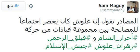 مضيفًا: “المصادر تقول إن علوش كان يحضر اجتماعًا للمصالحة بين مجموعة قيادات من حركة #أحرار_الشام و #فيلق_الرحمن #زهران_علوش #جيش_الإسلام”.