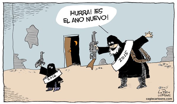 فنشر موقع “بولتيكال كارتونز” هذا الرسم ساخرًا من تنظيم الدولة وبداية العام الجديد: