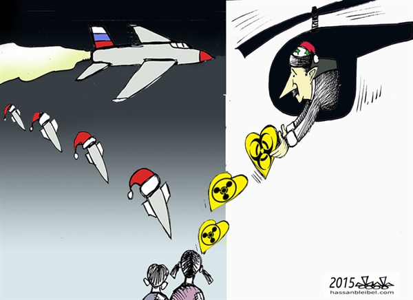 وعن الموت الذي يقدمه بوتين وبشار الأسد كهدايا لأطفال سوريا في أعياد الميلاد نشر موقع “كاجل” هذا الرسم: