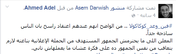Ahmed Adel: من الواضح انهم عندهم اعتقاد راسخ بإن الناس ساذجة جداً، المعلن اللى ما يحترمش الجمهور المستهدف من الحملة الإعلانية بتاعته لازم يتعاقب من نفس الجمهور ده على فكرة عشان ما يعملهاش تاني.