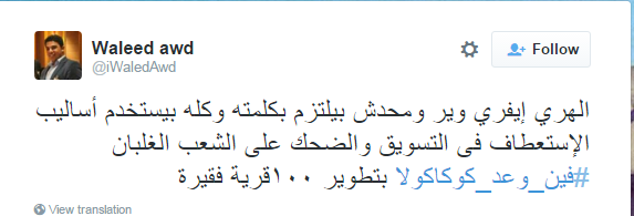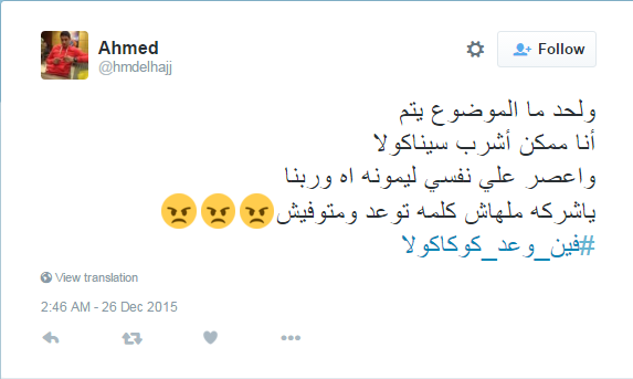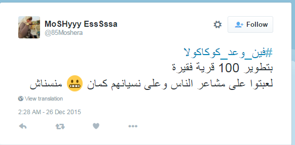 دشن مغردون عبر موقع التواصل الاجتماعي “تويتر” هاشتاج، #فين_وعد_كوكاكولا، هاجموا خلاله الشركة، بعد أن أخلت بوعدها بتطوير 100 قرية فقيرة؛ حيث كانت الشركة قد أعلنت في رمضان الماضي، لعملائها عن حملة جديدة على مواقع التواصل الاجتماعي، لزيادة حجم تمويل وتطوير وتنمية 100 قرية فقيرة، وذلك عن طريق تخصيص ميزانية إعلاناتها في شهر رمضان، لتطوير هذه القرى، على أن تقتصر إعلاناتها على مواقع التواصل الاجتماعي واليوتيوب.