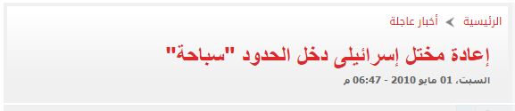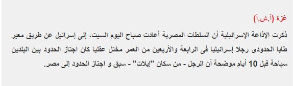 تداول رواد مواقع التواصل الاجتماعي، خبرًا عن قيام السلطات المصرية عام 2010 بإعادة "إسرائيلي" مختل عقليًا بعد اختراقه الحدود المصرية سباحة، وذلك بعد قيام الجنود المصريين بقتل مختل عقليًا فلسطيني لاختراقه الحدود البحرية المصرية
