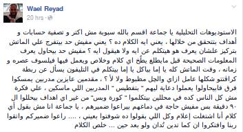 وقال وائل رياض على صفحته الشخصية على موقع التواصل الاجتماعي “فيس بوك”: “الاستوديوهات التحليلية يا جماعة أقسم بالله سبوبة مش أكتر و تصفية حسابات وأهداف بتتحقق من خلالها، يعني ايه الكلام ده؟ يعني مفيش حد بيتفرج على الماتش بتركيز علشان يعرف هو هيتكلم عن إيه ولا هيقول ايه؟ مفيش حد بيحاول يعرف المعلومات الصحيحة قبل ما يطلغ يطُخ اي كلام وخلاص ويعمل فيها فيلسوف عصره وزمانه.