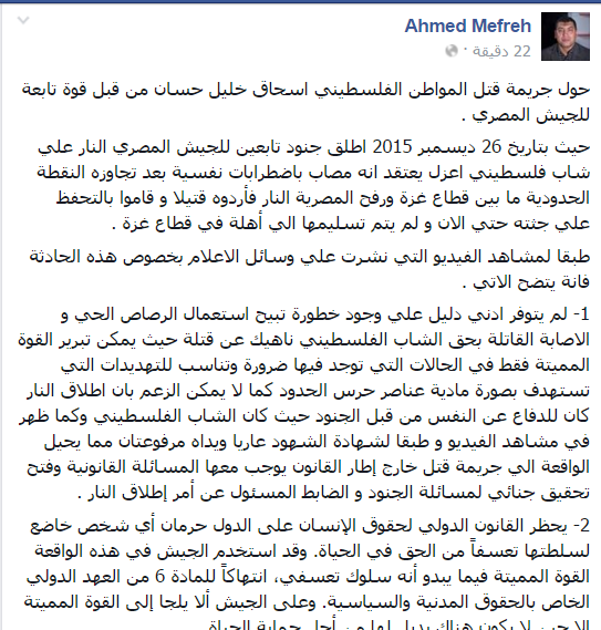نشر الناشط الحقوقي أحمد مفرح، عدة ملاحظات حول جريمة قتل المواطن الفلسطيني “إسحاق خليل حسان” من قبل قوة تابعة للجيش المصري.