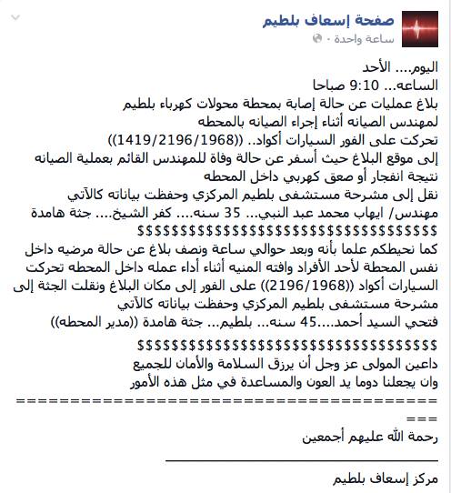 وقالت صفحة إسعاف بلطيم على الـ”فيس بوك”: اليوم الأحد الساعة.. 9:10 صباحًا تم الإبلاغ عن إصابة بمحطة محولات كهرباء بلطيم لمهندس الصيانة أثناء إجراء الصيانة بالمحطة تحركت على الفور السيارات أكواد (1419/2196/1968) إلى موقع البلاغ؛ حيث أسفر عن حالة وفاة للمهندس القائم بعملية الصيانة نتيجة انفجار أو صعق كهربائي داخل المحطة ونقل إلى مشرحة مستشفى بلطيم المركزي وحفظت بياناته كالآتي: مهندس إيهاب محمد عبدالنبي “35 سنة”.. كفر الشيخ.. جثة هامدة.