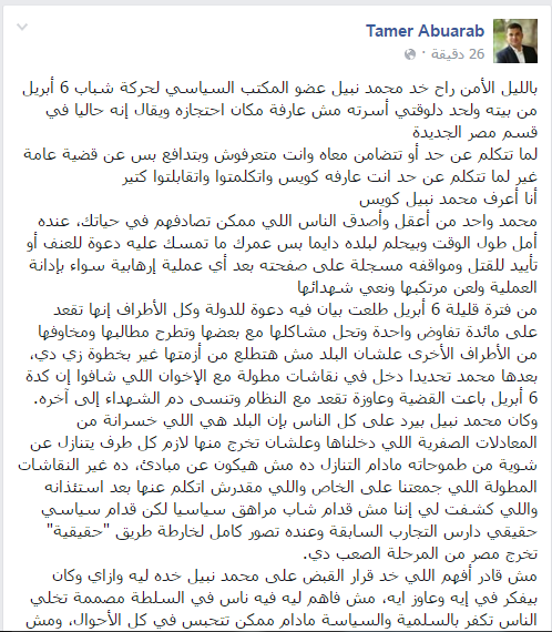 ندد الكاتب الصحفي تامر أبو عرب، بإلقاء القبض على محمد نبيل، عضو المكتب السياسي لحركة شباب “6 إبريل”، وإخفائه حتى الآن عن أسرته.