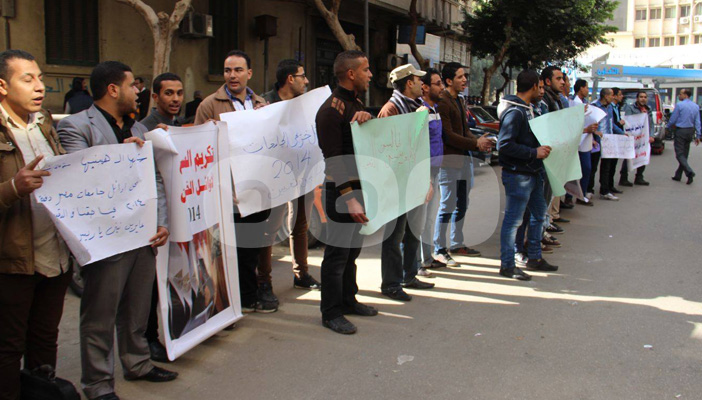 نظم عدد من أوائل الخريجين دفعة 2014 ظهر اليوم وقفة احتجاجية أمام مجلس الوزراء للمطالبة بحقهم في التعيين أسوة بزملائهم خريجي الدفعات السابقة.