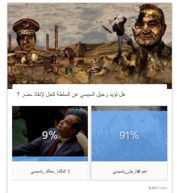 وأِشارت نتيجة الاستفتاء إلى تصويت 91% بـ”نعم ارحيل يا سيسي”، أما الخيار الآخر فكان “لا كلنا معاك يا سيسي” وجاء بنسبة 9% فقط من إجمالي المصوتين والذي زاد عددهم على 15 ألف مصوت.