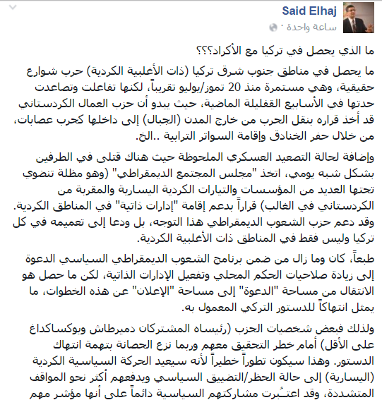 ويرى -عبر منشور له على “فيس بوك”- أن “حزب العمال الكردستاني قد أخذ قراره بنقل الحرب من خارج المدن (الجبال) إلى داخلها كحرب عصابات، من خلال حفر الخنادق وإقامة السواتر الترابية”.