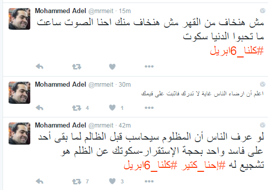 وطالب “عادل” بالحرية لإسماعيل الإسكندراني ومحمد نبيل، وأحمد ماهر، وعلاء عبدالفتاح، وكل المجهولين، وذيل تغريداته بهاشتاج #كلنا_6إبريل.