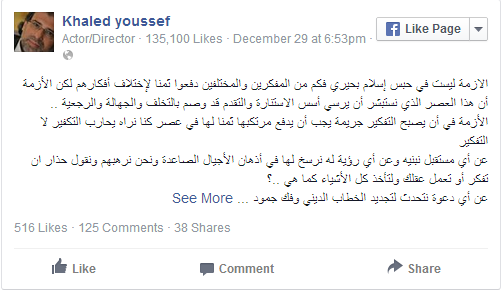 ناشد المخرج والبرلماني المصري خالد يوسف، عبدالفتاح السيسي بالعفو عن إسلام بحيري بعد الحكم بحبسه عاما واحدا في الاستئناف على حكم إدانته بتهم ازدراء الدين الإسلامي، وذلك عبر موقع التواصل الاجتماعي “فيس بوك”.