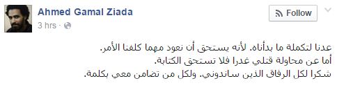 وكتب زيادة تدوينة عبر صفحته الشخصية بموقع التواصل الاجتماعي “فيس بوك”: “عدنا لتكملة ما بدأناه، لأنه يستحق أن نعود مهما كلفنا الأمر، أما عن محاولة قتلي غدرا فلا تستحق الكتابة، شكرًا لكل الرفاق الذين ساندوني ولكل من تضامن معي بكلمة”.