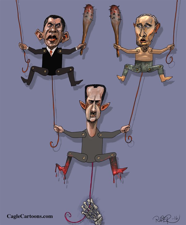 وسخر موقع “كاجل” من أوباما وبوتين وبشار بهذا الرسم: