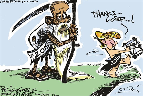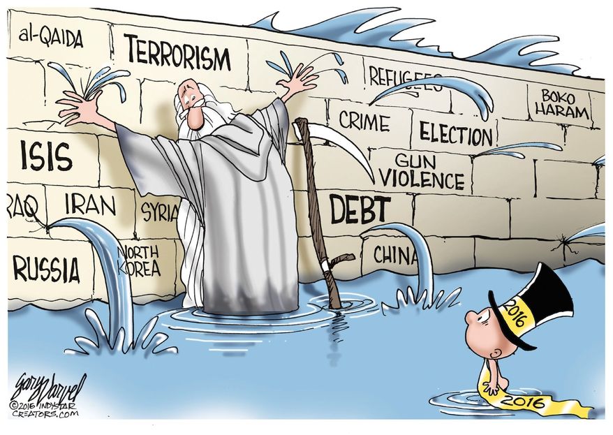 تداولت صحف ومواقع عالمية رسوما ساخرة من أزمات العالم، خاصة مع حلول العام الجديد حيث لم يتخلص العالم من إرهاب تنظيم الدولة، وكذلك اقتراب موعد الانتخابات الرئاسية الأميركية، وتعدد الأزمات الاقتصادية.