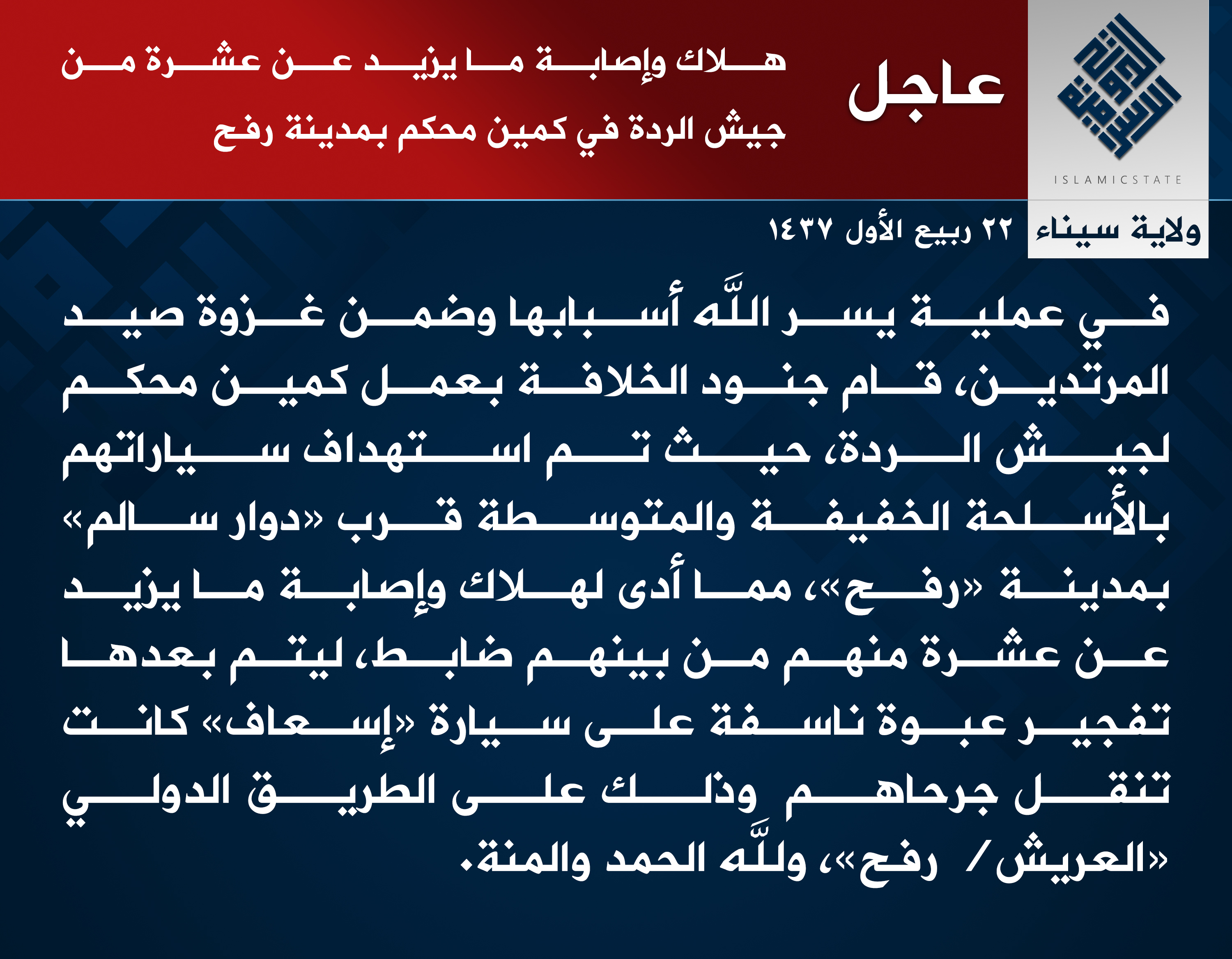 أعلن تنظيم “ولاية سيناء”، منذ قليل، تبنيه مقتل 10 جنود من الجيش المصري، وضابط؛ في هجوم غرب رفح بمحافظة شمال سيناء.