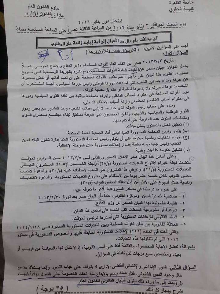 في إطار تفاعل “رصد” مع قرائها أرسل أحد الطلاب بكلية الحقوق بجامعة القاهرة رسالة تحتوي على ورقة أسئلة لامتحان مادة “القانون الإداري”، لطلاب دبلوم القانون العام، ويحتوي الامتحان على سؤالين؛ تعلق السؤال الأول بالبيان الذي أصدره عبدالفتاح السيسي في الثالث من يوليو عام 2013.
