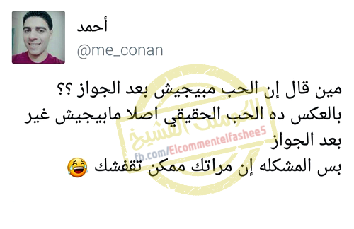 وقال “أحمد”: “مين اللي قال إن الحب مابيجيش بعد الجواز؟؟ بالعكس ده الحب الحقيقي أصلا ما بيجيش غير بعد الجواز، بس المشكلة إن مراتك ممكن تقفشك“.