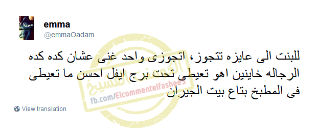 وقالت “إيما”: “للبنت اللي عايزة تتجوز، اتجوزي واحد غني عشان كده كده الرجالة خاينين أهو تعيطي تحت برج إيفيل أحسن ما تعيطي في المطبخ بتاع الجيران”.