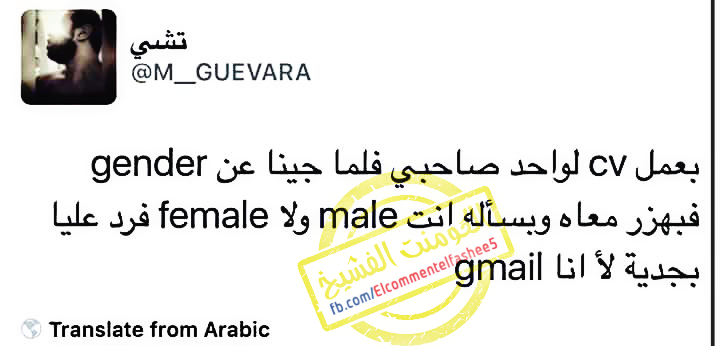 وقال “تشي”: “بعمل cv لواحد صاحبي فلما جينا عن gender فبهزر معاه وبسأله إنت male ولا female فردّ عليّ بجدية لأ أنا gmail”.