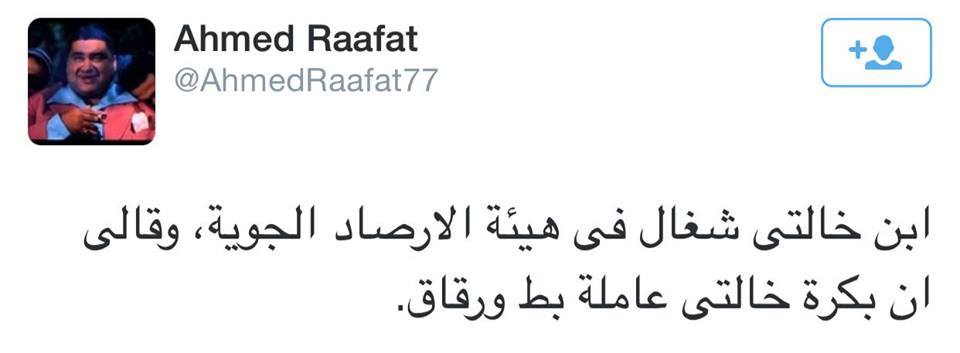 ومن أبرز التعليقات الخاصة بتقلب الطقس والمناخ العام، جاء تعليق “أحمد رأفت” الذي جاء فيه “ابن خالتي شغال في هيئة الأرصاد الجوية، وقال لي إن بكرة خالتي عاملة بط ورقاق”.