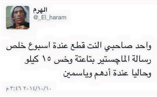وقال “الهرم”: “واحد صاحبي النت قطع عنده أسبوع خلص رسالة الماجستير بتاعته وخس 15 كيلو وحاليا عنده أدهم وياسمين”.