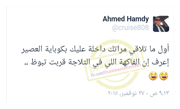 وقال “أحمد حمدي”: “أول ما تلاقي مراتك داخلة عليك بكوباية العصير اعرف إن الفاكهة اللي في التلاجة قربت تبوظ”.