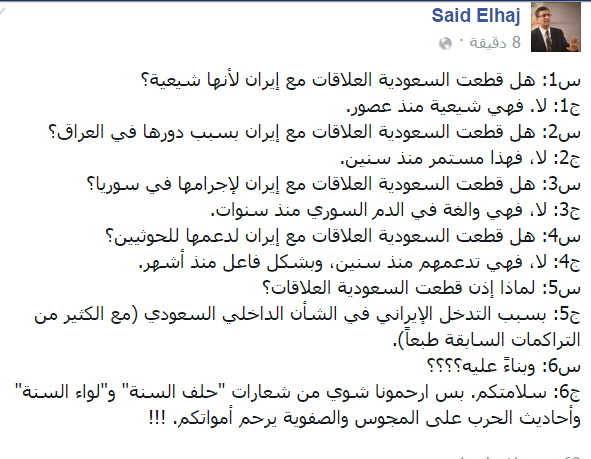ووجه “الحاج” عددًا من الاسئلة ينفي خلالها ما يثار من أسباب عن قطع السعودية علاقتها بإيران، منها أن يكون السبب إجرام إيران في سوريا، أو دعمها للحوثيين في اليمن، مشيرًا إلى أن تلك الأمور منذ سنوات وليست حديثة كي تبني عليها السعودية قرارًا مثل ذلك.