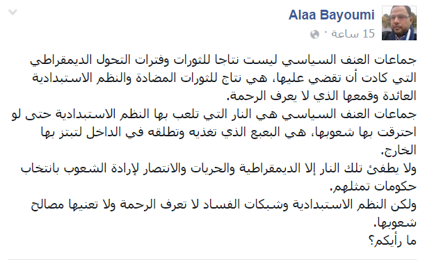 وتابع “بيومي” قائلًا: “ولا يطفئ تلك النار إلا الديمقراطية والحريات والانتصار لإرادة الشعوب بانتخاب حكومات تمثلهم. ولكن النظم الاستبدادية وشبكات الفساد لا تعرف الرحمة ولا تعنيها مصالح شعوبها“.