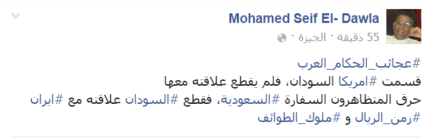 وقال “سيف الدولة” -في منشور له على “فيس بوك”-: “قسمت أميركا السودان، فلم يقطع علاقته معها.. حرق المتظاهرون السفارة السعودية، فقطع السودان علاقته مع إيران”، مختتمًا منشوره بهاشتاجي #زمن_الريال و#ملوك_الطوائف.