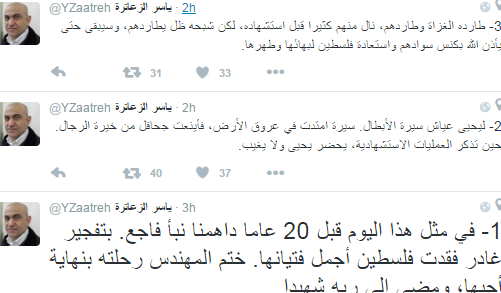 أحيا الكاتب الفلسطيني ياسر الزعاترة، ذكرى المهندس الفلسطيني، يحيى عياش؛ حيث يوافق اليوم 5 يناير، الذكرى العشرين لمقتله؛ حيث لقي ربه عام 1996 وقت أن كان يتحدث مع أبيه على الهاتف النقال؛ إذ تم اقتناصه عبر الهاتف من خلال عبوة ناسفة.