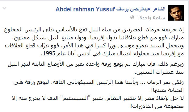 وأضاف -عبر منشور له على “فيس بوك”- “جريمة حرمان المصريين من مياه النيل تقع بالأساس على الرئيس المخلوع مبارك؛ فهو من قطع علاقاتنا بدول إفريقيا، ودول منابع النيل بشكل ممنهج”.
