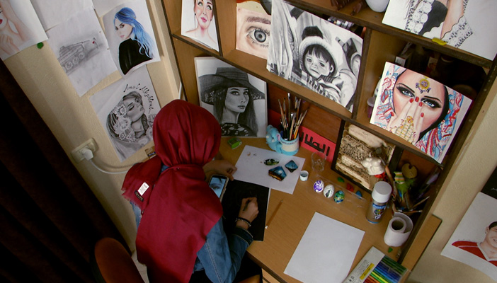 وعلى جدران غرفتها ومكتبها، تلصق الكحلوت، بعضًا من رسوماتها، التي تنوعت بين لوحات للطبيعة، ولشخصيات مشهورة، كالرئيس الفلسطيني الراحل ياسر عرفات، وغيره.
