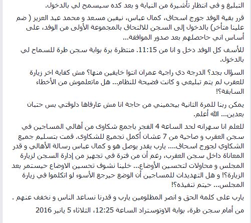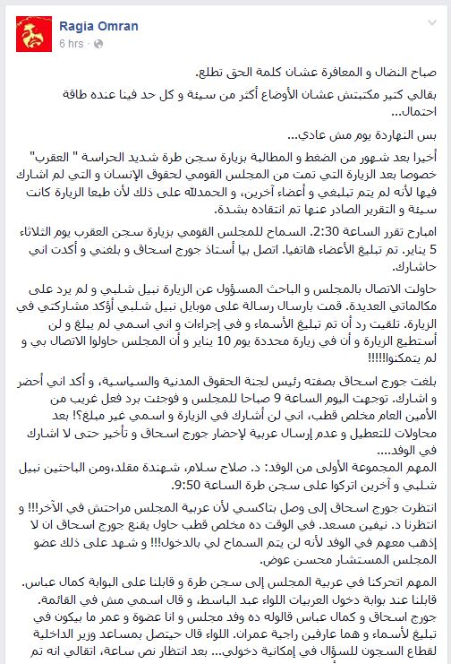 وقالت راجية عمران: إنه تم إبلاغها بموعد الزيارة المقررة للمجلس القومي لحقوق الإنسان، عن طريق اتصال هاتفي من جورج إسحاق والتي استعدت للذهاب وتوجهت إلى مكان تجمع أعضاء المجلس وتمكنت من الوصل سجن العقرب.