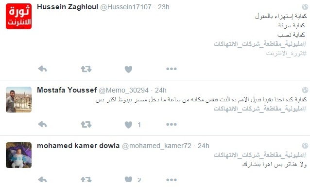 وقالت الصفحة في هشتاج أطلقته عبر “فيس بوك”: “اكتب هنا أي انتهاك حصل من أي شركة اتصالات تجاهك كمستخدم وشاركنا يوم 28 فالرد عليهم بـ#مليونية_مقاطعة_شركات_الانتهاكات لكل الشركات إنترنت وموبايل”.
