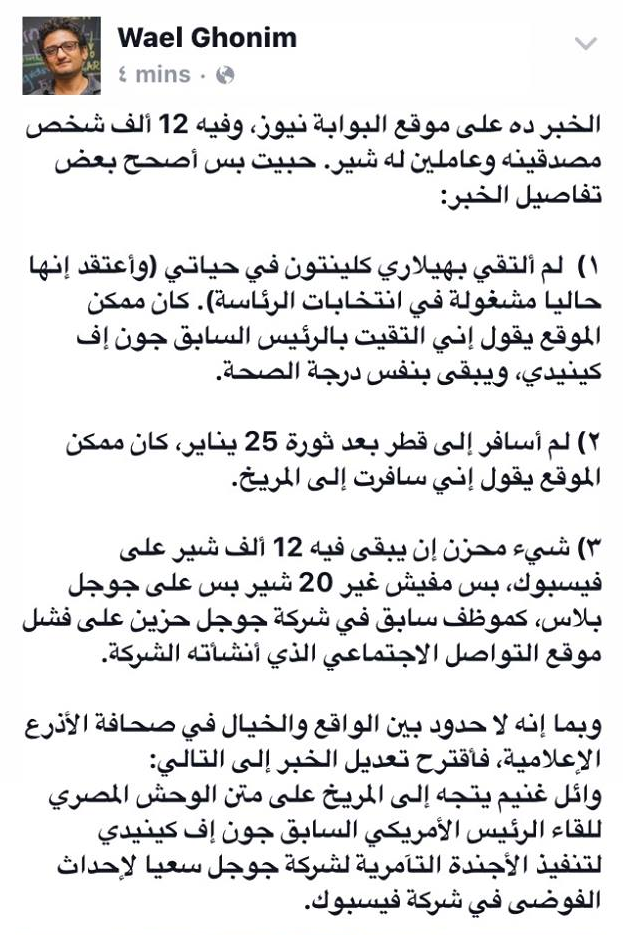 4- واختتم منشوره ساخرًا: “وبما إنه لا حدود بين الواقع والخيال في صحافة الأذرع الإعلامية، فأقترح تعديل الخبر إلى التالي؛ وائل غنيم يتجه إلى المريخ على متن الوحش المصري للقاء الرئيس الأميركي الراحل جون إف كينيدي لتنفيذ الأجندة التآمرية لشركة جوجل سعيًا لإحداث الفوضى في شركة فيسبوك”.