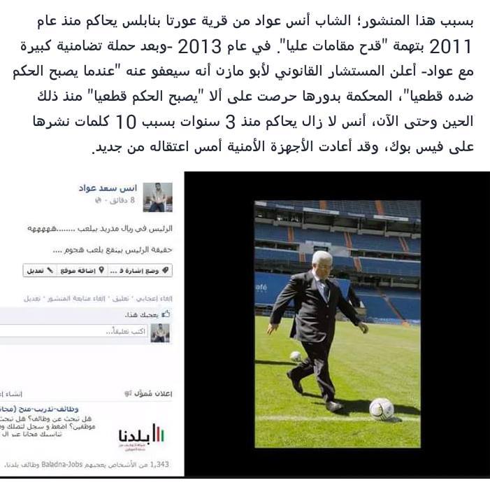 وكان “عواد”، قد نشر عام 2011، على صفحته بموقع التواصل الاجتماعي “فيس بوك”، صورة لـ”أبو مازن” في أحد الملاعب وهو يلعب كرة القدم، وقال “لاعب هجوم جديد”، وعلق عليها ساخرًا: الرئيس بيلعب في ريال مدريد.. حقيقة الرئيس بينفع يلعب هجوم