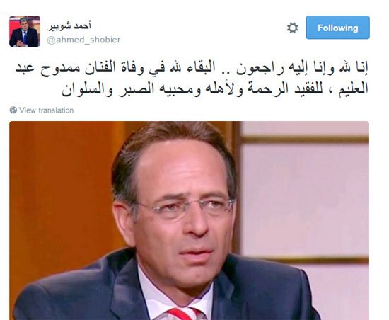 – شوبير: “إنا لله وإنا إليه راجعون.. البقاء لله في وفاة الفنان ممدوح عبدالعليم، للفقيد الرحمة ولأهله ومحبيه الصبر والسلوان”.