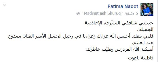 -فاطمة ناعوت: “حبيبتي شافكي المنيري، الإعلامية الجميلة، قلبي معك. أحسن الله عزاءك في رحيل الجميل الآسر الفنان ممدوح عبدالعليم.. أسكنه الله الفردوس وطيب خاطرك”.