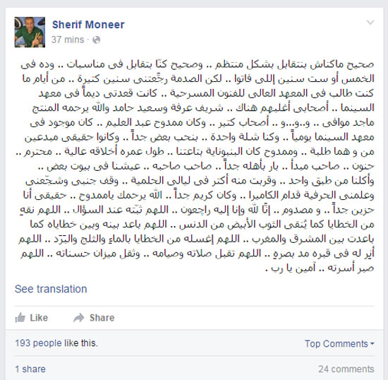 – الممثل شريف منير: “طول عمره أخلاقه عالية.. محترم.. حنون.. صاحب مبدأ.. بار بأهله.. صاحب صاحبه.. كريم جدًا، وعلمني الحرفية قدام الكاميرا.. اللهم أنر له في قبره مد بصره”.