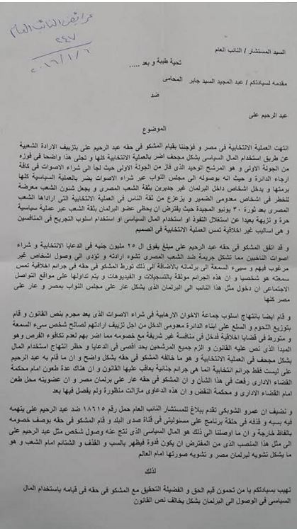 وأضاف: “وقد أنفق المشكو في حقه عبدالرحيم علي مبلغا يفوق الـ25 مليون جنيه في الدعايا الانتخابية وشراء أصوات الناخبين مما تشكل جريمة ضد الشعب المصري لتشوه إرادته”.