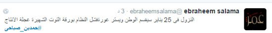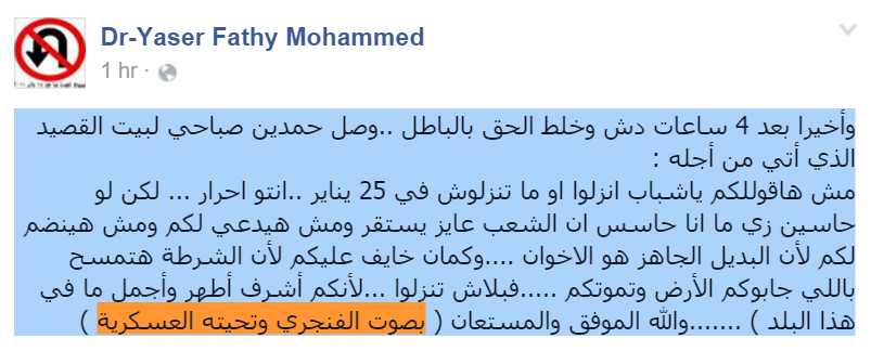 مش هاقوللكم يا شباب انزلوا أو ما تنزلوش في 25 يناير..انتو أحرار.. لكن لو حاسين زي ما أنا حاسس إن الشعب عايز يستقر ومش هيدعي لكم ومش هينضم لكم لأن البديل الجاهز هو الإخوان.. وكمان خايف عليكم لأن الشرطة هتمسح باللي جابوكم الأرض وتموتكم.. فبلاش تنزلوا.. لأنكم أشرف وأطهر وأجمل ما في هذا البلد.. والله الموفق والمستعان (بصوت الفنجري وتحيته العسكرية).