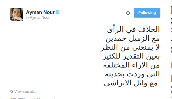وقال “نور” -في تغريدة له عبر حسابه في موقع “تويتر”-: “الخلاف في الرأي مع الزميل حمدين لا يمنعني من النظر بعين التقدير للكثير من الآراء المختلفة التي وردت بحديثه مع وائل الإبراشي”.