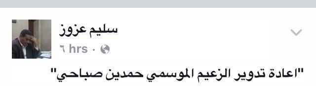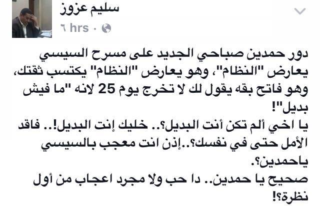 واعتبر الكاتب سليم عزوز، ظهور حمدين صباحي في حوار مع إحدى الفضائيات ورفضه للنزول في 25 يناير، هو “إعادة تدوير الزعيم الموسمي حمدين صباحي”، قائلًا -في منشور له على حسابه في موقع “فيس بوك”-: “دور حمدين صباحي الجديد على مسرح السيسي.. يعارض “النظام”، وهو يعارض “النظام” يكتسب ثقتك، وهو فاتح بقه يقول لك لا تخرج يوم 25 لأنه “مافيش بديل“!”.